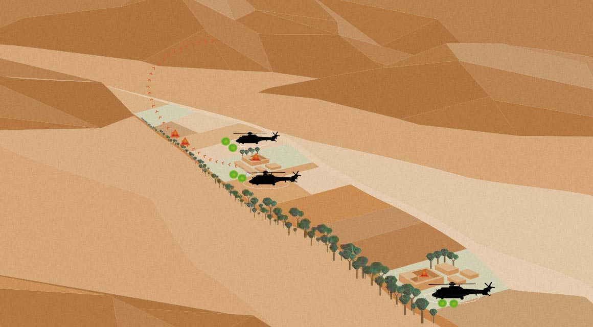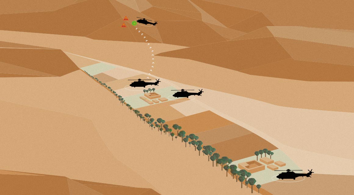Terwijl onze teams in recordtempo de vijf verdachte quala’s doorzoeken, krijgt ik informatie over drie gevluchte personen. Een Apachepiloot bevestigt dit beeld. Onmiddellijk besluit ik tot een vervolgoperatie. Ik formeer een klein team van operators en klim in een van de Cougars, die naar de locatie vliegt waar de vermoedelijke HVI’s zich schuilhouden. Door middel van een tactische berglanding worden we bij het nieuwe doel afgezet, slechts enkele kilometers van de quala’s beneden.