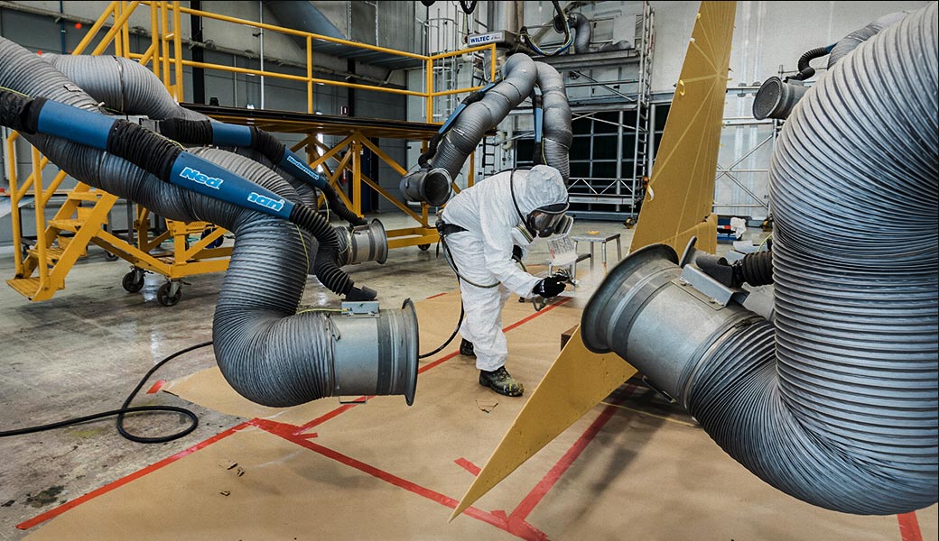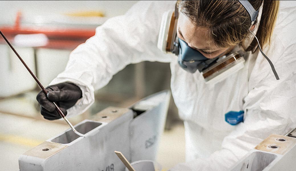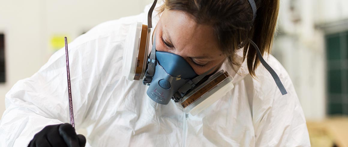 Mijn dagelijkse tools zijn de verfspuit en verschillende penselen. Verven en spuiten doen we in speciale, beschermende outfits
