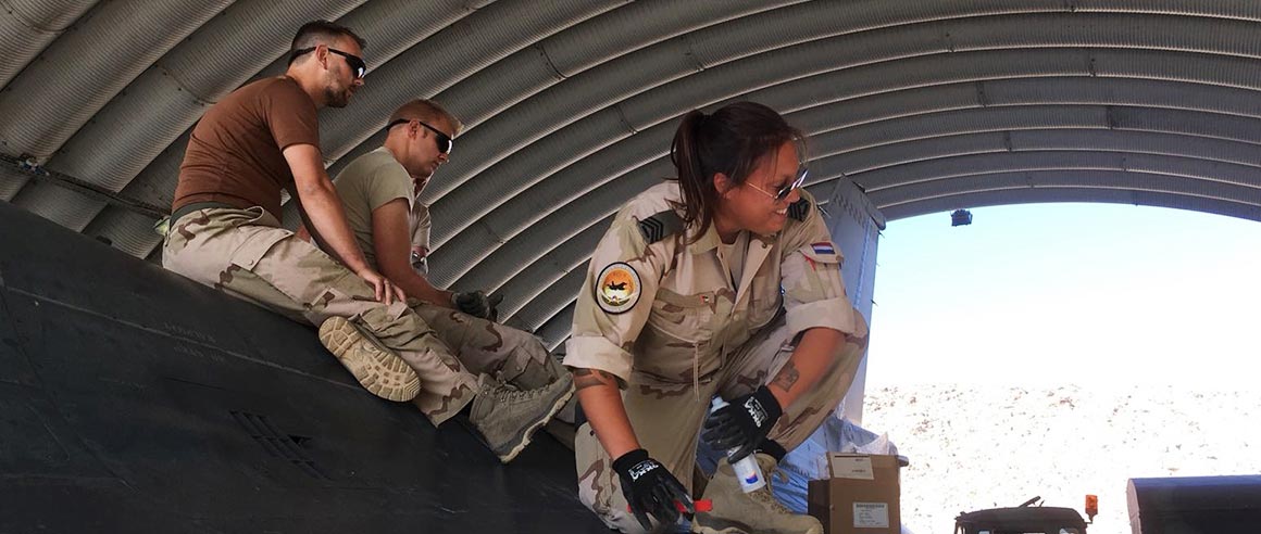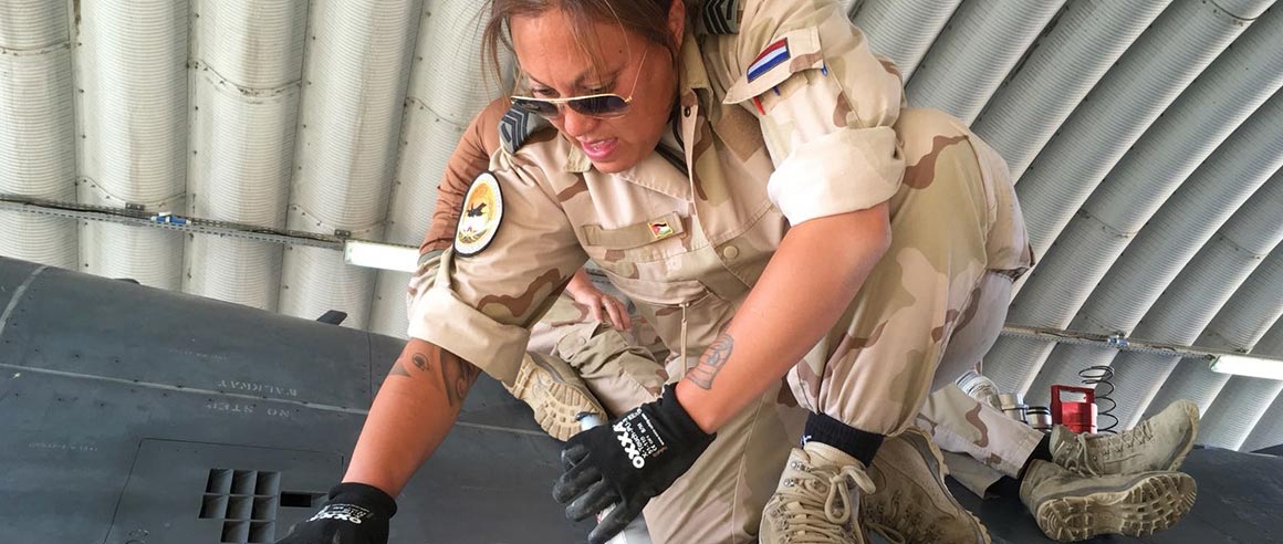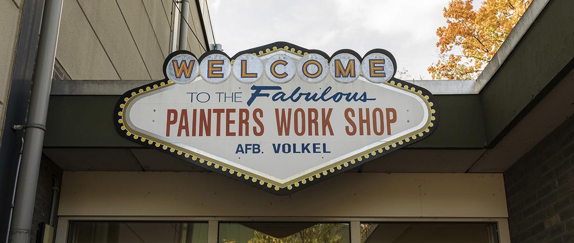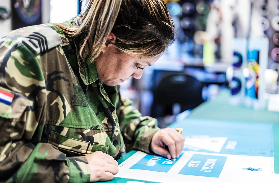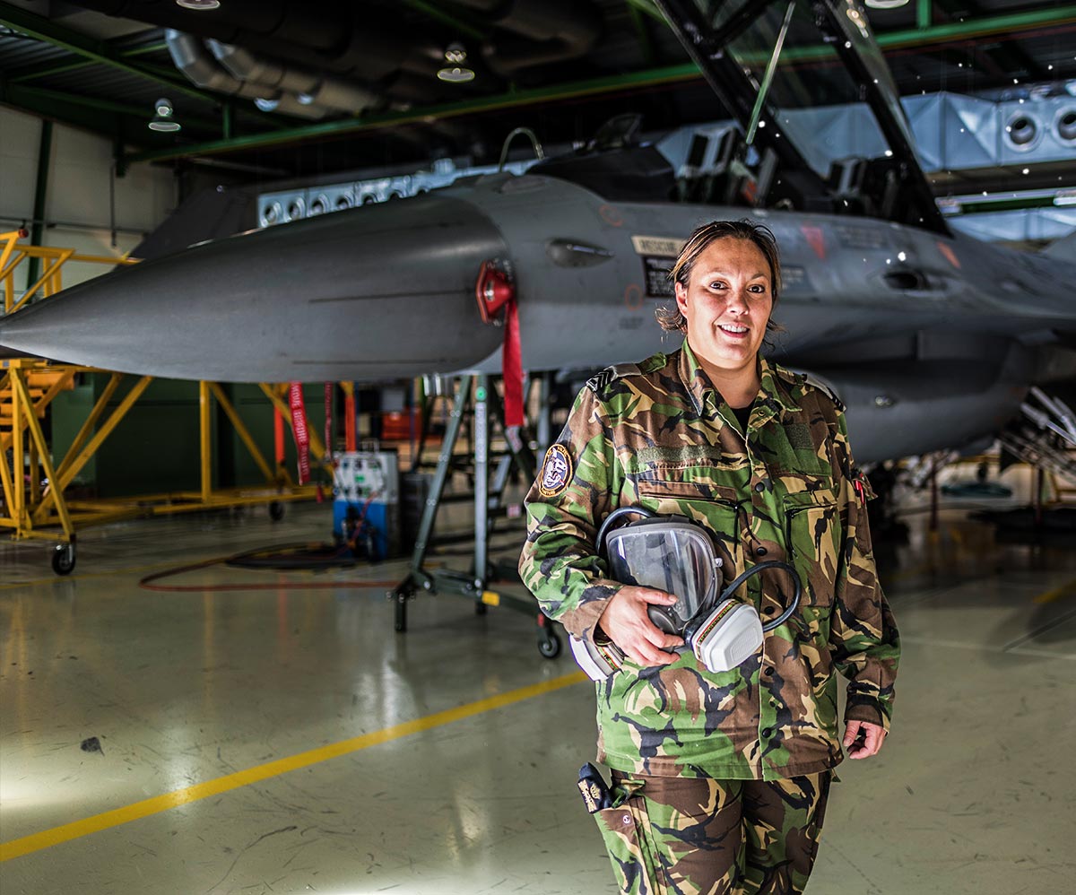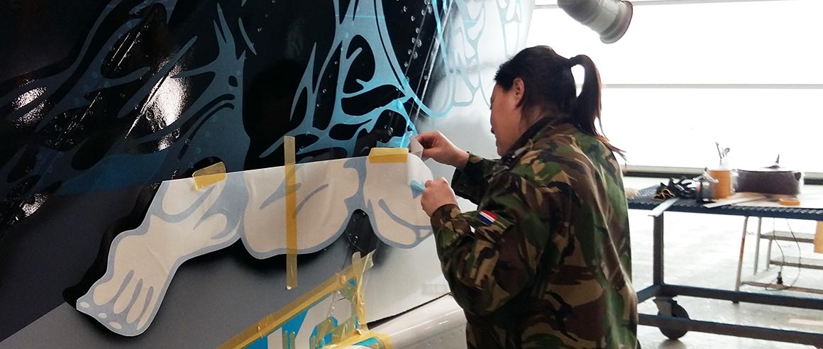 in onze grote schilderswerkplaats op de vliegbasis. Als het moet, past daar een hele F-16 in. Daarnaast heb ik als schilder